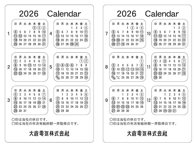 弊社休日のお知らせ(2026年1~12月)