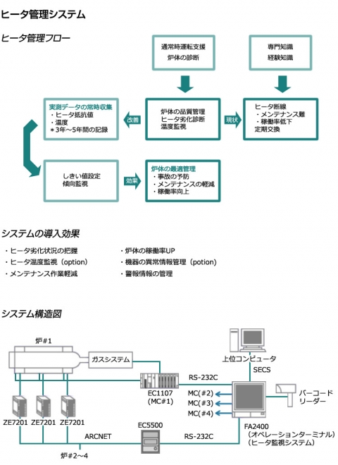 【システムの導入効果】 ◆ヒータ劣化狀況の把握 ◆爐體の稼動率UP ◆ヒータ溫度監視(Option) ◆機器の異常情報管理(Option) ◆メンテナンス作業軽減 ◆警報情報の管理